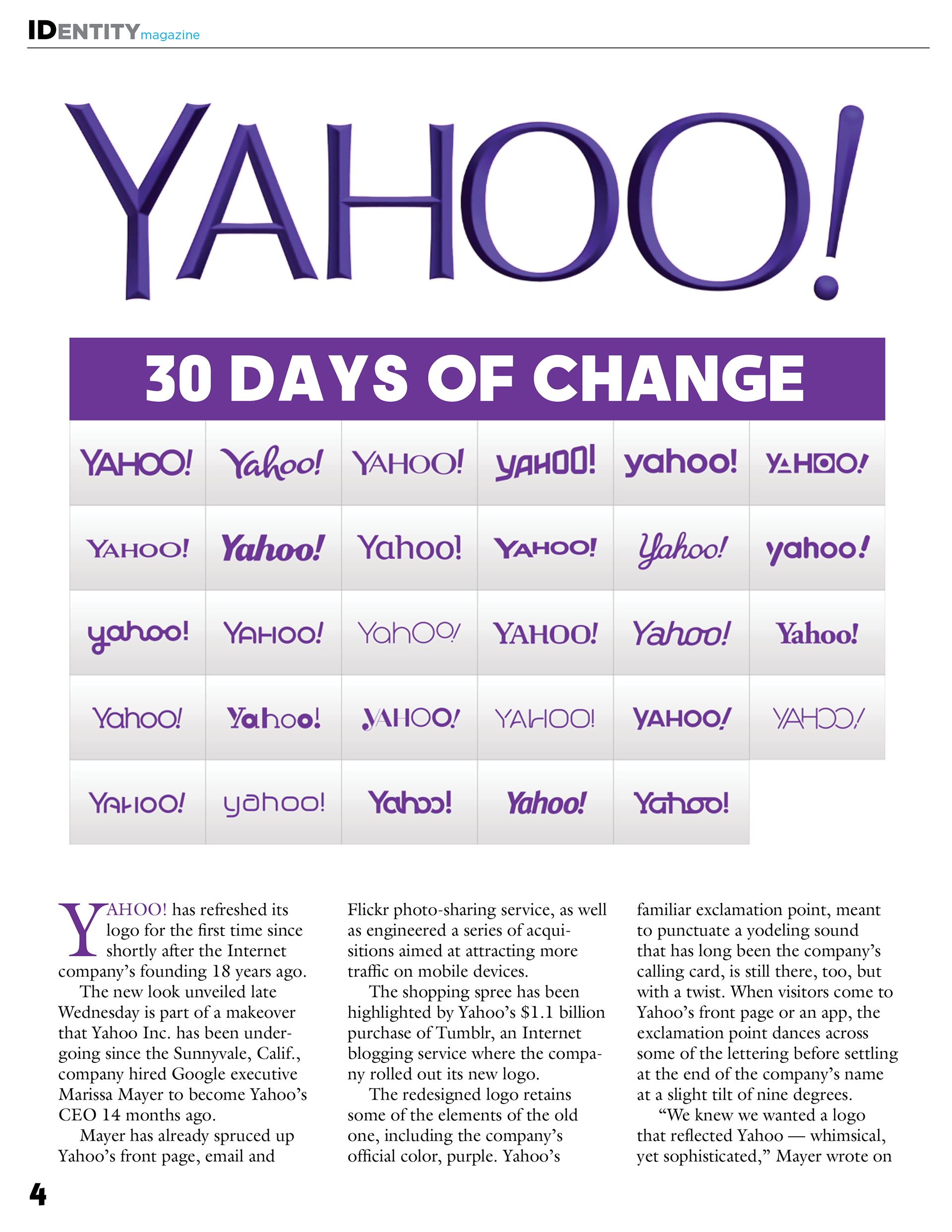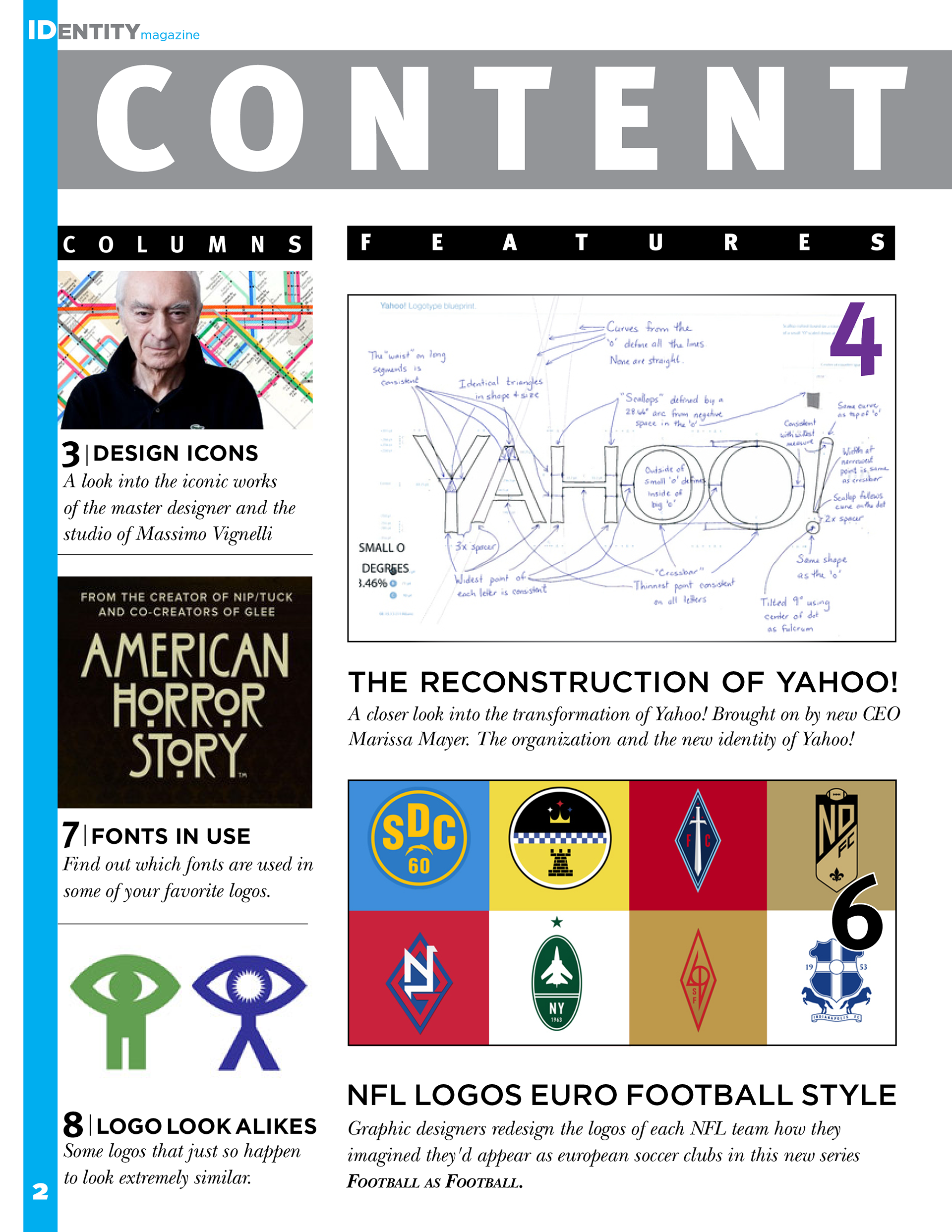 Magazine project for my Graphic Design class at Baruch College. We were asked to create a magazine with a design theme. I chose to design a magazine about logo's. The biggest redesign at the time was Yahoo, so I chose to have them grace the cover.